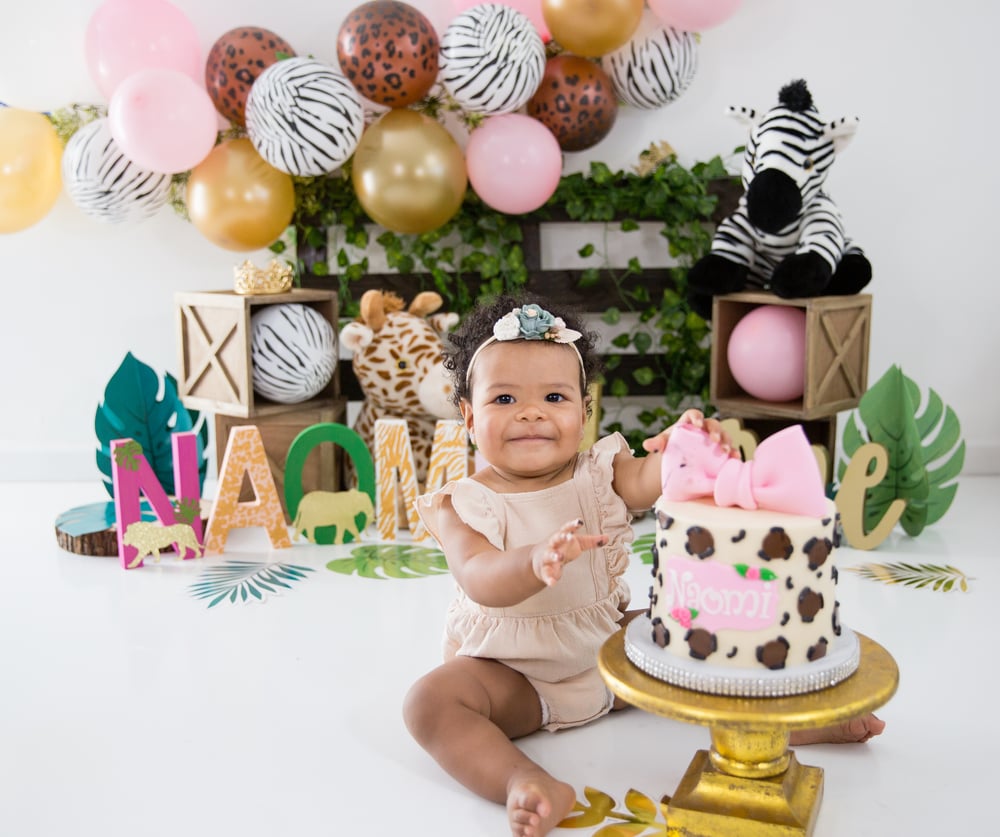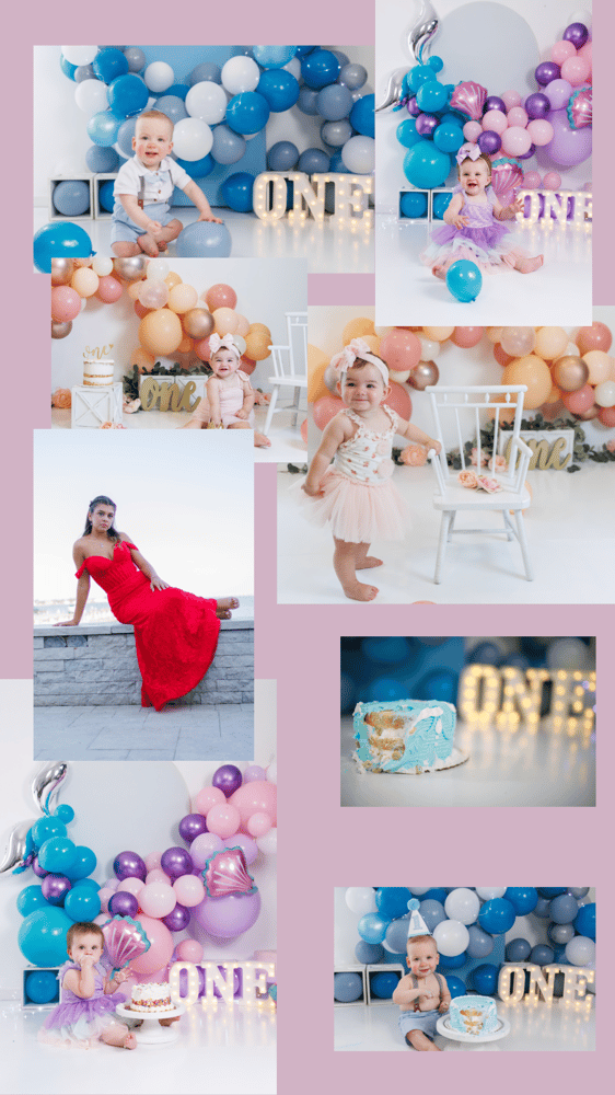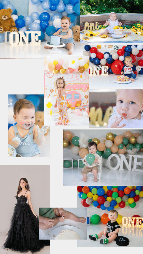 All Cake Smash sessions include balloons (if you want) and I create the scene you want. You are to bring 1 outfit to start with and then a cake smash outfit. You are to also bring the cake (I do not recommend Red icing & due to food allergies I will not provide the cake) & any props you may have to bring is great!